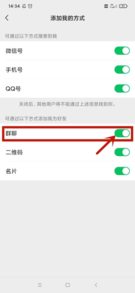 随后在功能界面中,点击关闭下方的群聊按钮,就可以不让群里的人加自己。(灰色是关闭,绿色个打开)
